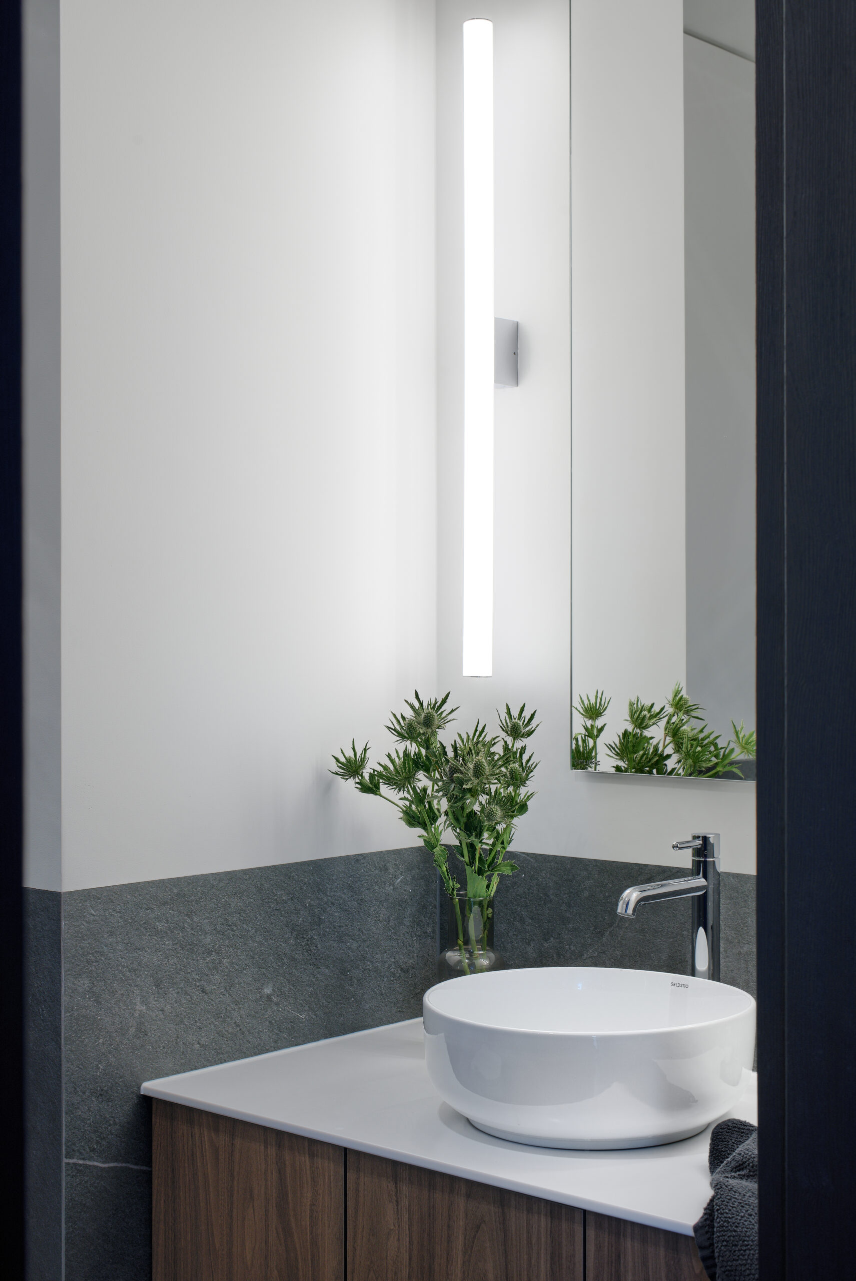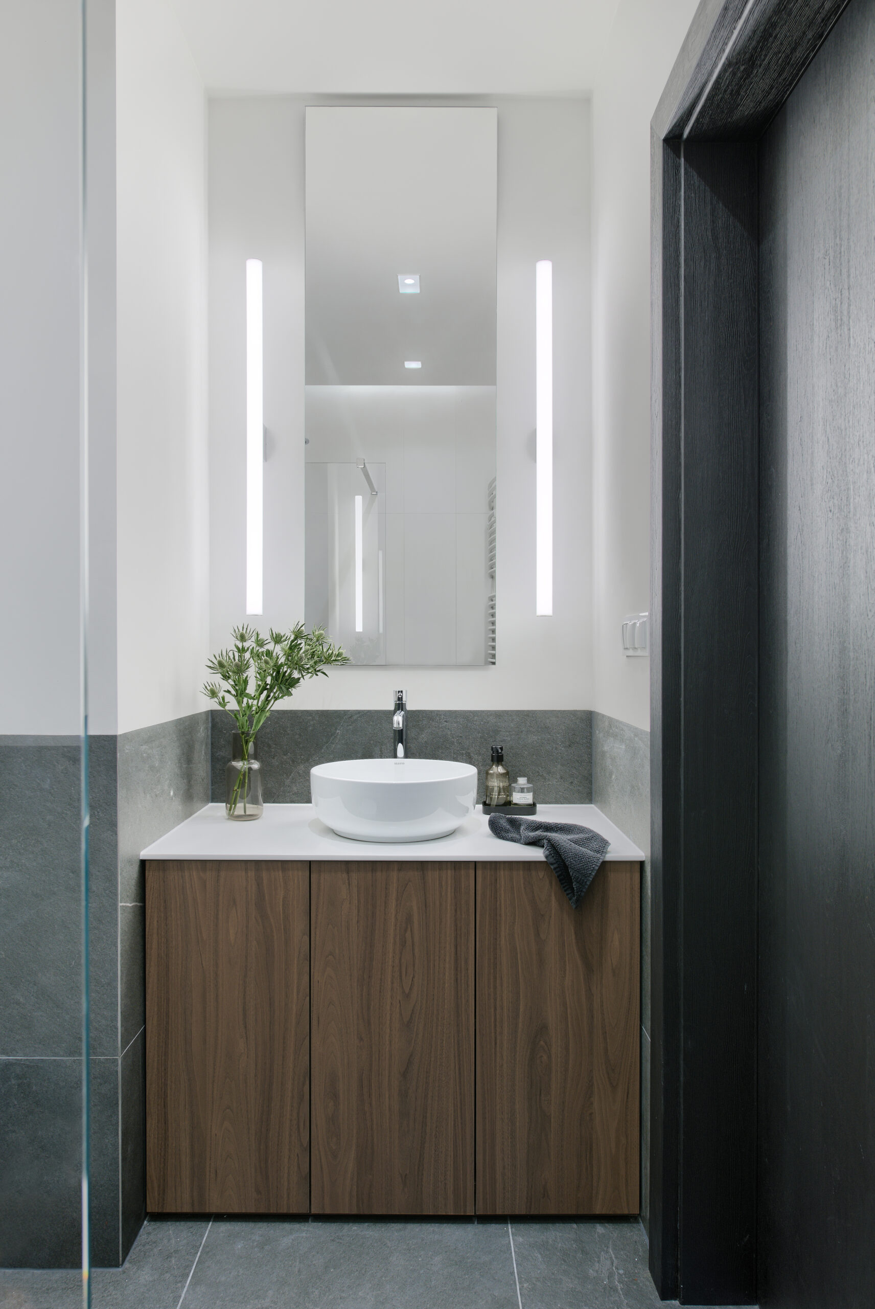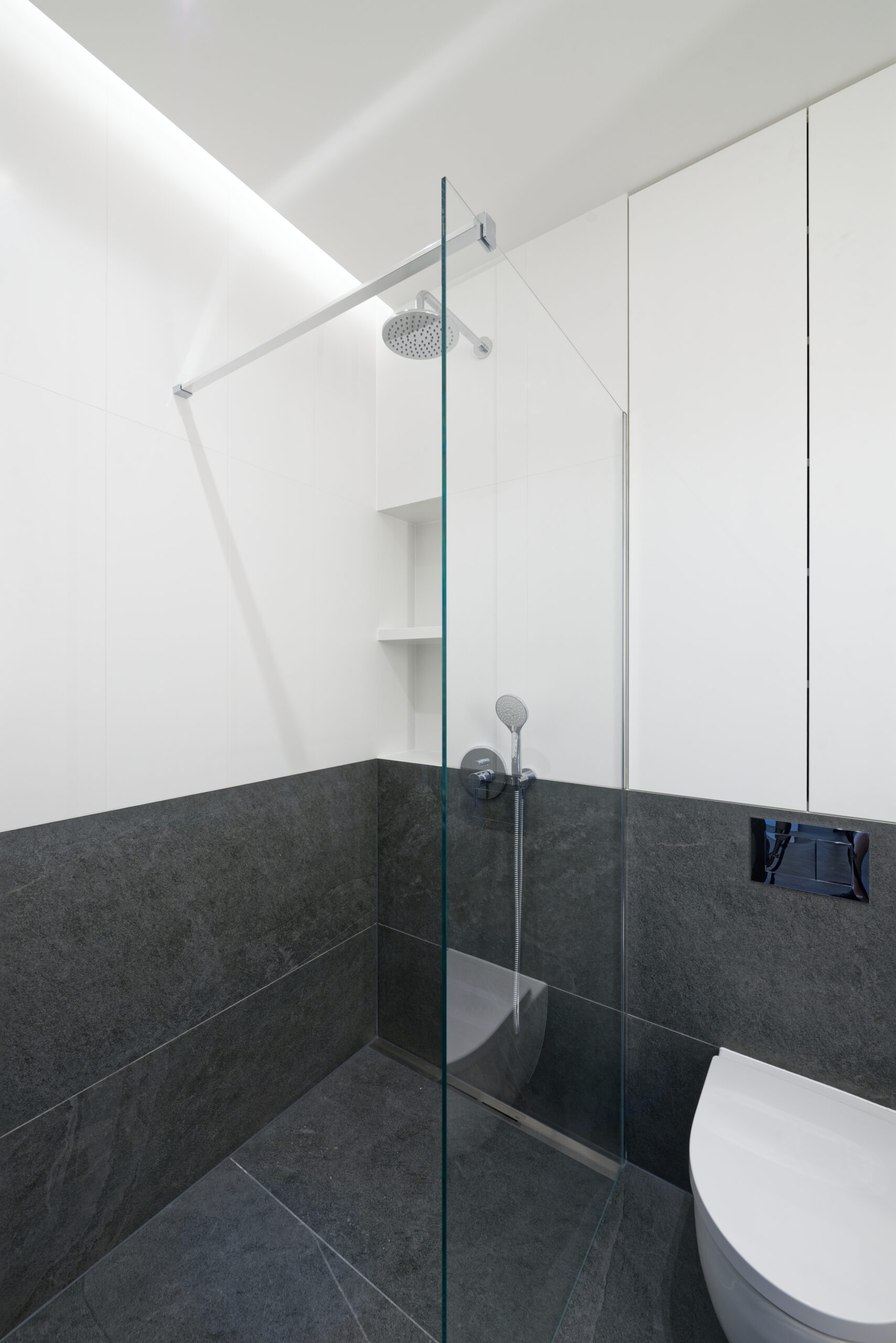 Kolejnym ruchem zmieniającym propozycję dewelopera była zmiana aranżacji łazienki. Tutaj postawiliśmy z inwestorami na rozwiązanie, które wzbudzi potencjalnie większe emocje niż klasyczny układ łazienki z wanną, wc i wiszącą umywalką. W miejscu wanny pojawił się wygodny, spory prysznic typu walk-in. Natomiast we wnęce, w miejscu pralki pojawiła się elegancka strefa z umywalką nablatową, pod którą wykonaliśmy szafkę z dużą iloscią miejsca na środki czystości czy wiadro. Podobnie nad toaletą, została wykonana szafka na wymiar, zgrabnie wkomponowana, by nie rzucała się w oczy, wewnątrz kryjąc półki na wszelkie akcesoria kosmetyczne. Pierwotnie w projekcie nie było półek otwartych, jednak w trakcie realizacji okazało się, że wentylacja wykonana przez dewelopera była tak solidna, że demontaż wentylatora wiązałby się z dodatkowymi kosztami dla Inwestora. Jak to w każdej realizacji, a inwestycyjnej zwłaszcza ( czyli jak to miało miejsce w tym przypadku) rolą architekta jest również dbanie o to, by trzymać się założeń budżetowych .