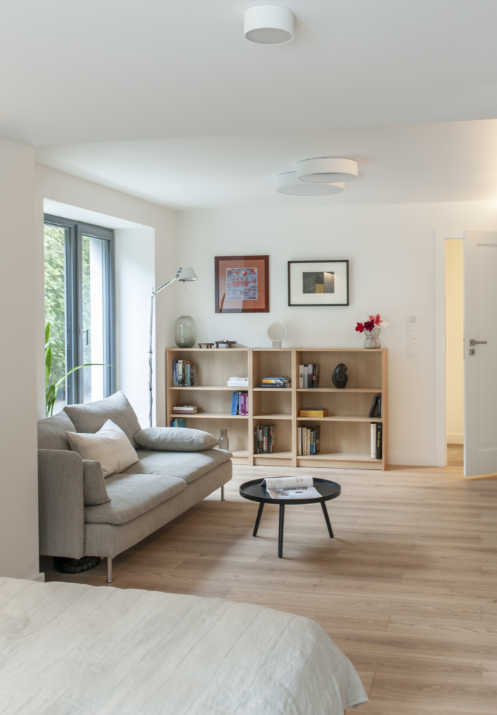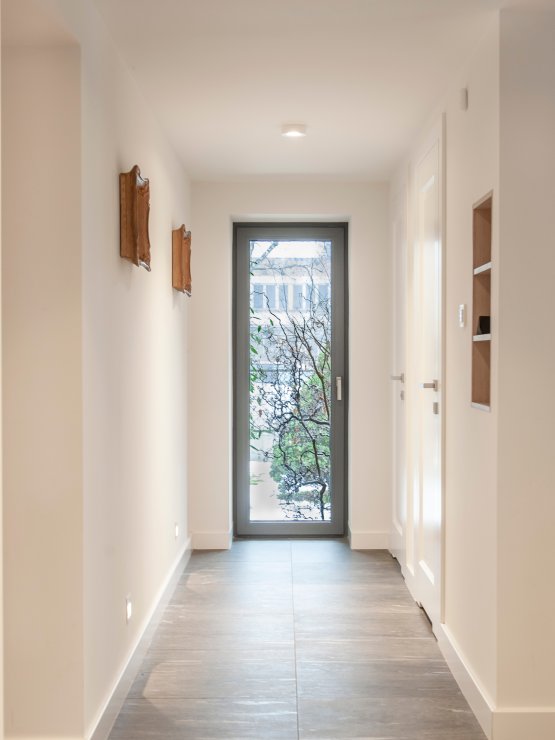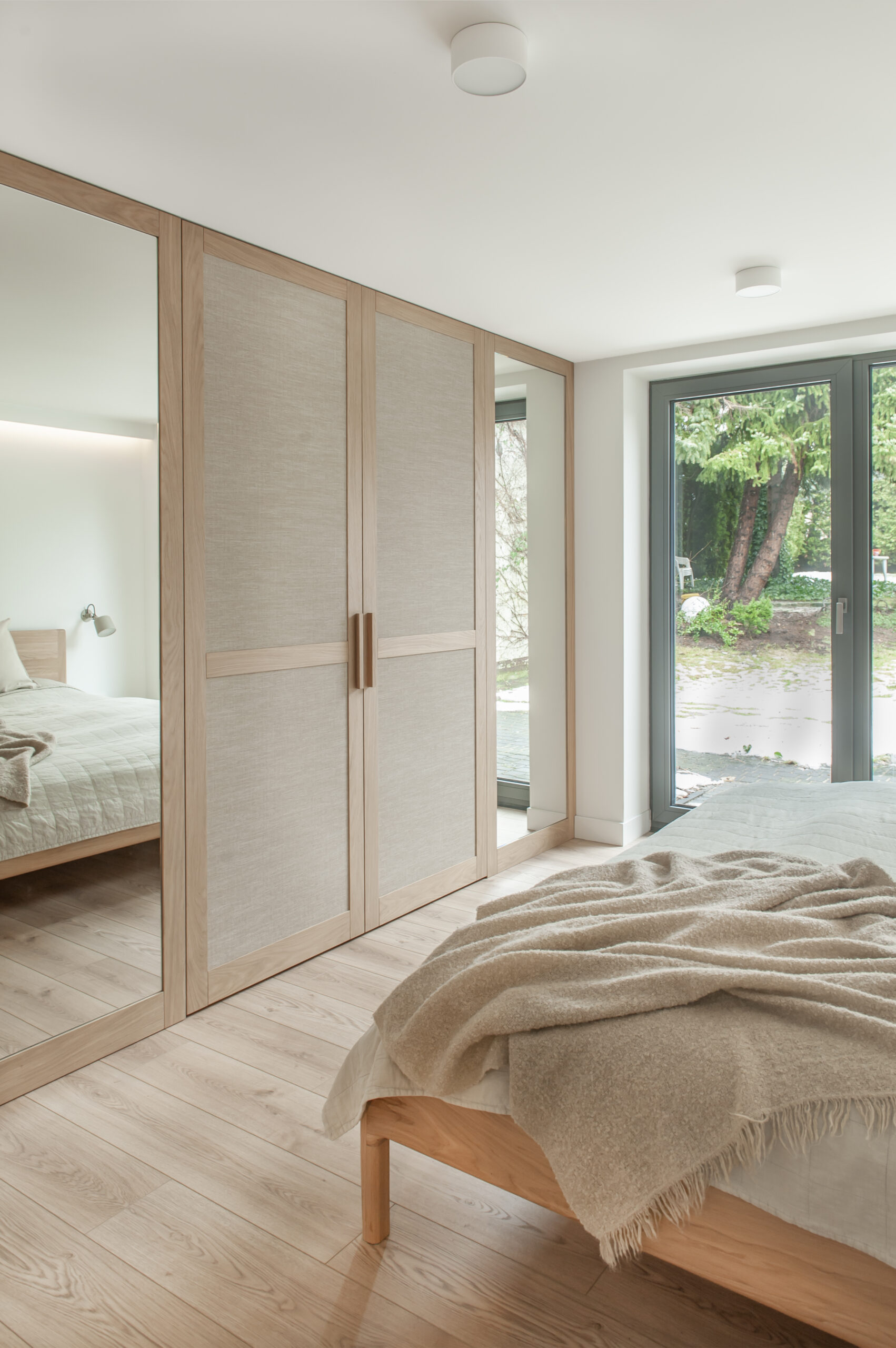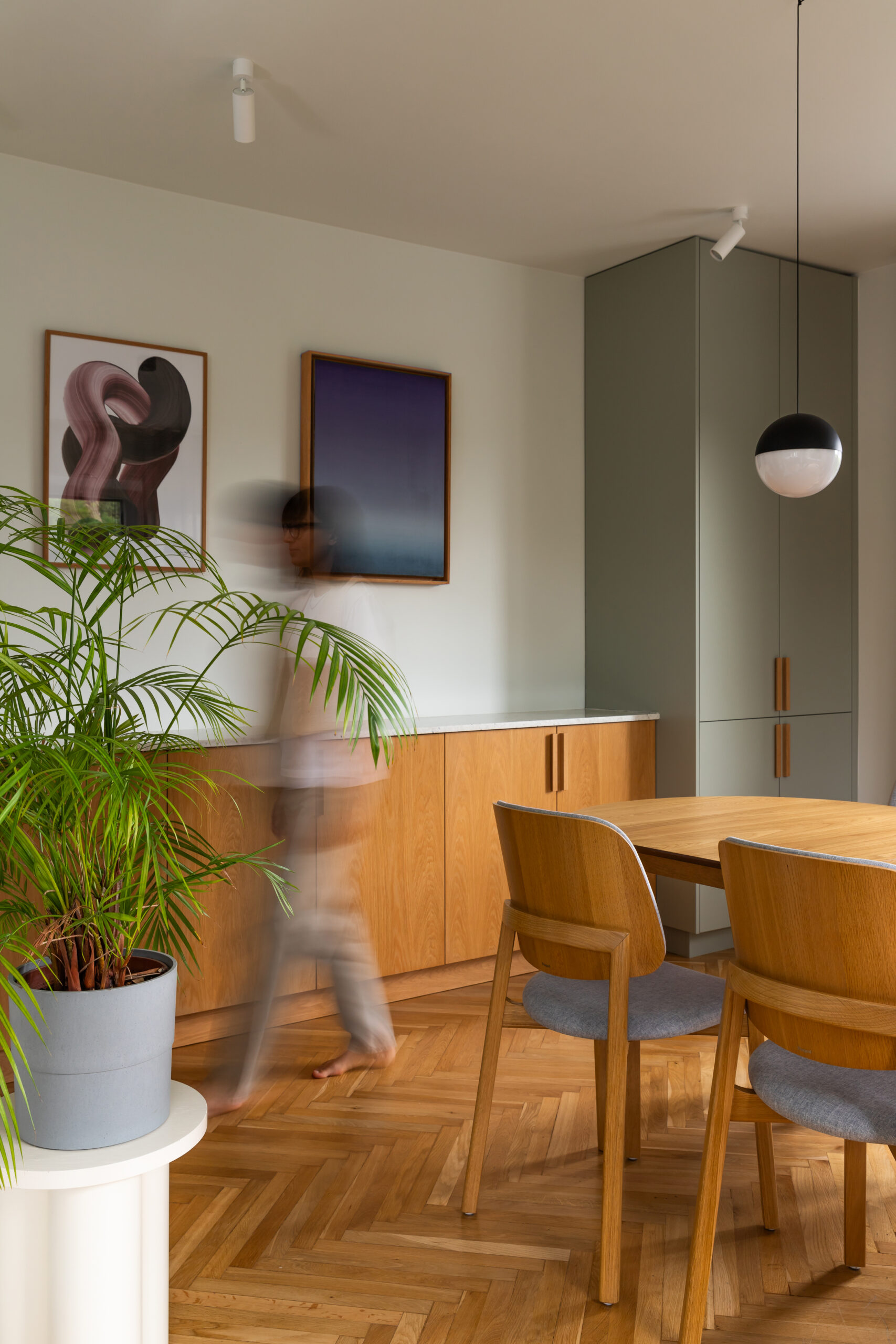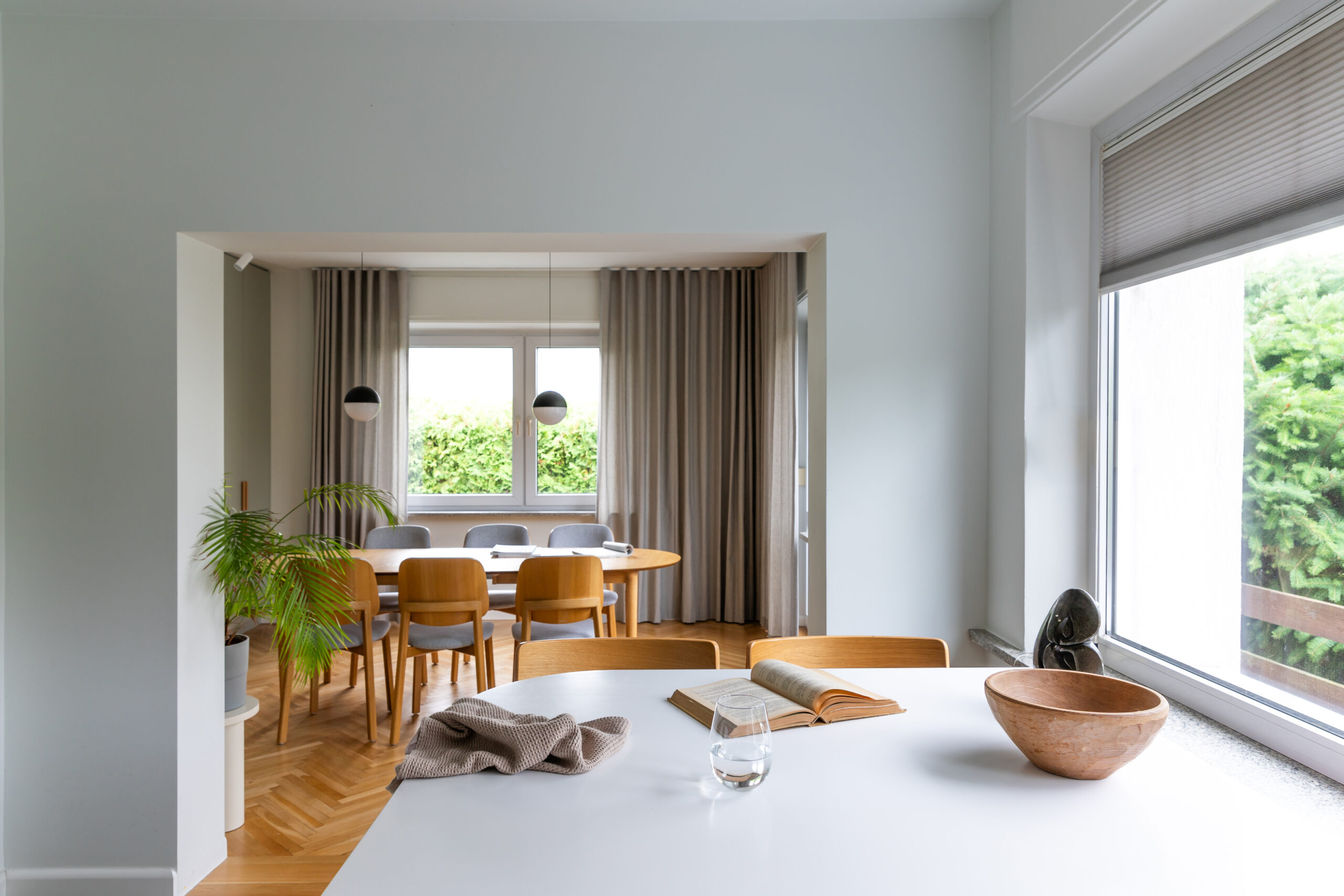 Remont domu obejmował generalną przebudowę funkcji oraz aranżacji przestrzeni. Dzięki łączeniu pomieszczeń udało się uzyskać dużą sypialnię z garderobą i oddzielną łazienką oraz jadalnie połączoną z kuchnią.